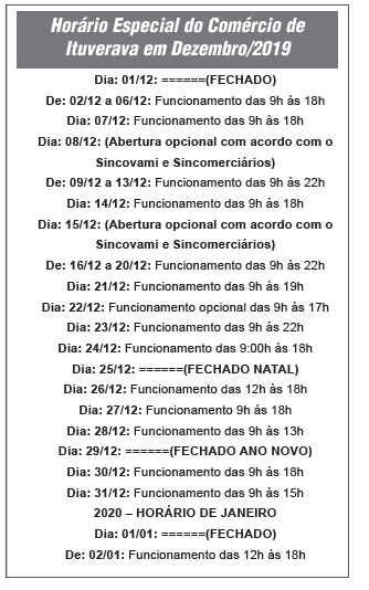 Confira o horário especial do comércio de Ituverava no quadro.