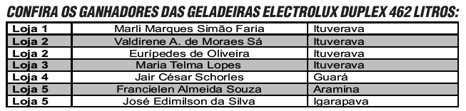 O quarto sorteio da mega promoção Aniversário Premiado 40 anos Liberdade foi realizado no sábado, dia 14 de dezembro. Confira abaixo os ganhadores das sete geladeiras Electrolux Duplex 462 litros.