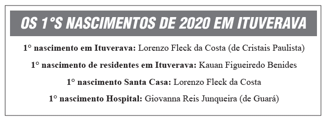 O garoto Lorenzo Fleck da Costa é o primeiro nascido em Ituverava em 2020. A criança é filho de Ana Carolina Fleck e Rogério Carlos Pereira da Costa. Ele nasceu às 8:45h do dia primeiro de janeiro na Santa Casa de Misericórdia. Com 3,64 quilos e 48 centímetros, o obstetra foi Dr. Aparecido Barbosa Fiumari e a pediatra Dra. Luciene Peixoto Vaz.