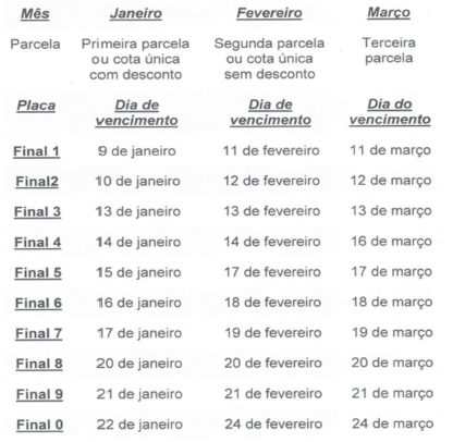 Vale lembrar que se o motorista não efetuar o pagamento do imposto na data de vencimento, levará multa, pontos na carteira e não consegue licenciar o veículo. Ainda, o nome do proprietário do carro pode ser encaminhado para a lista de maus pagadores de órgãos como o Serasa e SPC Brasil. Confira na tabela as datas de vencimentos.