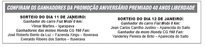 Com total aceitação e aprovação dos clientes, a Promoção Aniversário Premiado 40 Anos Liberdade se encerrou no dia 12 de janeiro, após os sorteios de dois carros Fiat Mobi 0 km e três motos Honda CG 160 Fan.
