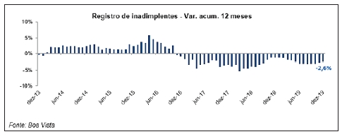 De acordo com os números oficiais do SCPC, a inadimplência do consumidor recuou 2,6% ao longo de 2019. Na avaliação mensal com ajuste sazonal, dezembro apresentou variação negativa de 1,4% frente a novembro. Quando comparado o resultado contra o mesmo mês de 2018, o indicador caiu 0,7%.