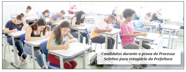A prova do Processo Seletivo para estagiários foi realizada no dia 22 de janeiro, na Escola Humberto França. O Processo Seletivo teve 275 participantes inscritos. O gabarito da prova foi divulgado ontem, dia 27 de janeiro, e o resultado do Processo Seletivo com a lista de classificação será divulgado amanhã, dia 29 de janeiro, ambos no site da Prefeitura.
