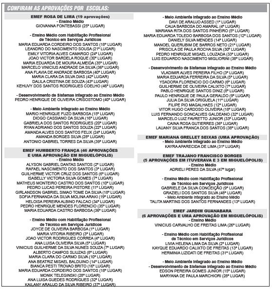 Confira a lista dos alunos aprovados no Vestibulinho da ETEC “Professor José Ignácio Azevedo Filho” oriundos das Escolas Municipais de Ensino Fundamental de Ituverava, separados por escolas: