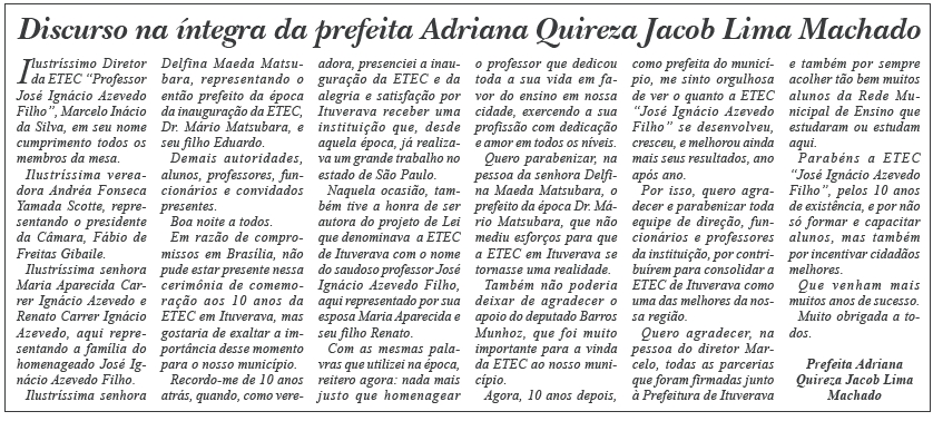 A senhora Delfina Sanae Maeda Matsubara, representando o então prefeito da época Dr. Mário Takayoshi Matsubara, também falou sobre os 10 anos da instituição. “A criação de uma ETEC para Ituverava foi um grande sonho do Mário Matsubara. Com muito esforço, ele conseguiu concretizar e gerar belíssimos frutos, e ao longo desses 10 anos criou uma nova geração de profissionais que elevam o nome da nossa cidade por conta dos ensinamentos de alta qualidade oferecidos nessa instituição. Parabéns a todos que acreditam nesse ano e que esses anos se multipliquem sempre mais”, ressalta.