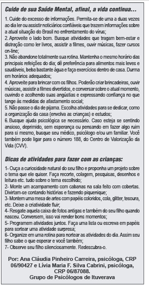 O estresse psicológico durante este período de enfrentamento pode manifestar-se: medos e preocupação sobre a própria saúde e a saúde dos seus entes queridos, mudança no padrão de sono ou ingestão alimentar e agravamento das doenças crônicas.