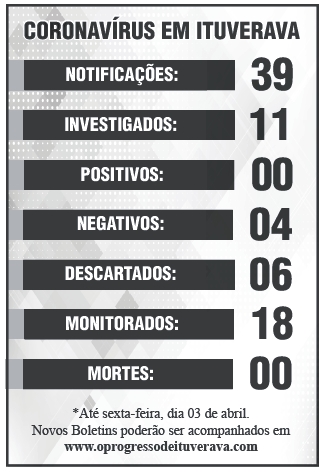 Segundo o boletim divulgado, sexta-feira, dia 03 de abril, a cidade de Ituverava recebeu 39 notificações de COVID-19. As notificações são casos suspeitos no município e que são acompanhados pela Vigilância Epidemiológica de Ituverava.