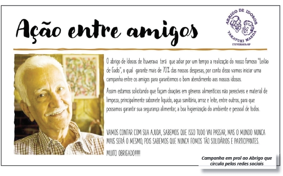 Devido à pandemia do Coronavírus, o tradicional Leilão de Gado Beneficente do Abrigo de Idosos “Comendador Takayuki Maeda”, que estava marcado para o dia 19 de abril, foi adiado para sete de junho. Por conta disso, a entidade está lançando uma Ação Entre Amigos que visa arrecadar doações para manter o bom atendimento dos residentes.