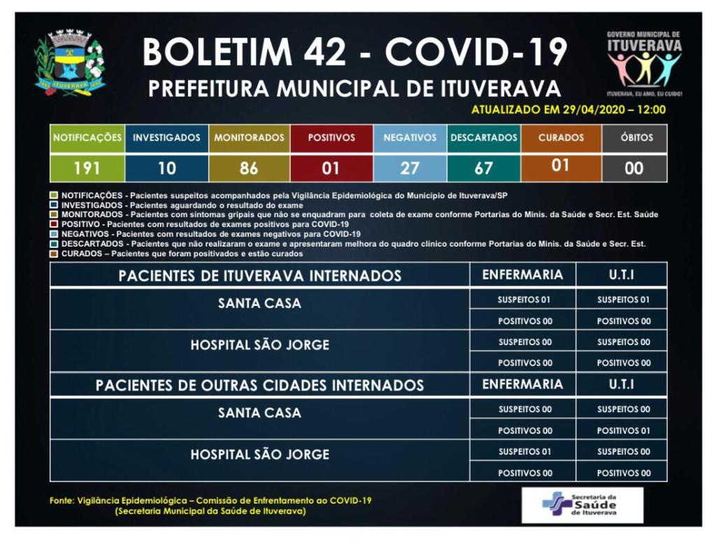29/04/20 O Progresso de Ituverava Boletim COVID-19 A cidade de Ituverava segue as recomendações do Ministério da Saúde. No entanto, é reforçado o pedido para que todos se mantenham em suas casas e tomem as medidas de prevenção necessárias. Compartilhe isso: Compartilhar no WhatsApp(abre em nova janela) WhatsApp Compartilhar no Facebook(abre em nova janela) Facebook Compartilhar no X(abre em nova janela) 18+ Relacionado