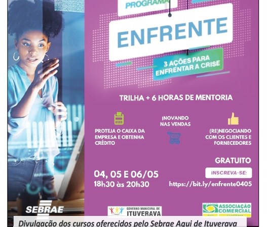 Os cursos abordarão três temas: Inovando suas vendas; Proteja o caixa da empresa e obtenha crédito; (Re) negociando com clientes e fornecedores. Os cursos serão realizados das 18h30 às 20h30, cada tema com duas horas de duração. Os interessados devem se inscrever no site: https://www.sympla.com.br/programa-enfrente__843731.