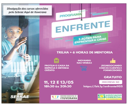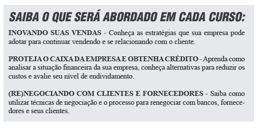 Os cursos abordarão três temas: Inovando suas vendas; Proteja o caixa da empresa e obtenha crédito; (Re)negociando com clientes e fornecedores. Os cursos serão realizados das 18h30 às 20h30, cada tema com duas horas de duração. Os interessados devem se inscrever no site: https://www.sympla.com.br/programa-enfrente__843736.