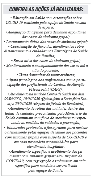 Segundo a Secretária da Saúde, Janine Carvalho Ferreira Rokutan, “a Atenção Básica de Saúde do município está se empenhando diariamente para manter seus atendimentos de maneira adequada e de qualidade ao enfrentamento da COVID-19”.