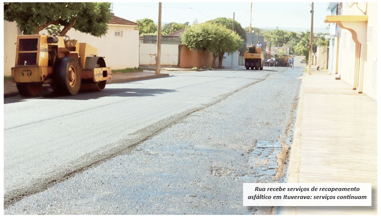 Nesse momento, está sendo realizado o processo de recapeamento asfáltico que foi conquistado através do Programa Respeito à Vida, do Detran-SP, que foi assinado pela Prefeitura de Ituverava e pelo governador João Doria, durante a inauguração do Ganhatempo “Antônio Jacob”, no dia 26 de novembro do ano passado.