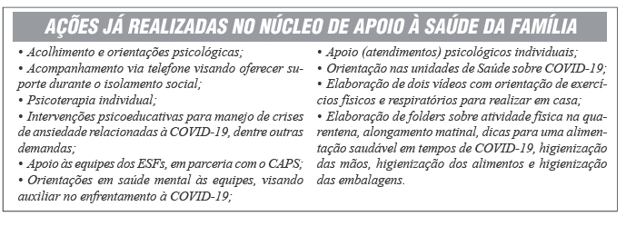 Nessa semana, foram anunciadas as ações que estão sendo realizadas desde 13 de março de 2020 pela equipe do NASF (Núcleo de Apoio à Saúde da Família), que é composta por nutricionistas, fisioterapeutas e psicólogas do município, que atuam nas Unidades de Saúde da Estação, Central, Cohab, Benedito Trajano Borges, Vila São Jorge, Vila Independência, Jardim Guanabara, Capivari da Mata, São Benedito da Cachoeirinha, Aparecida do Salto e CAPS.