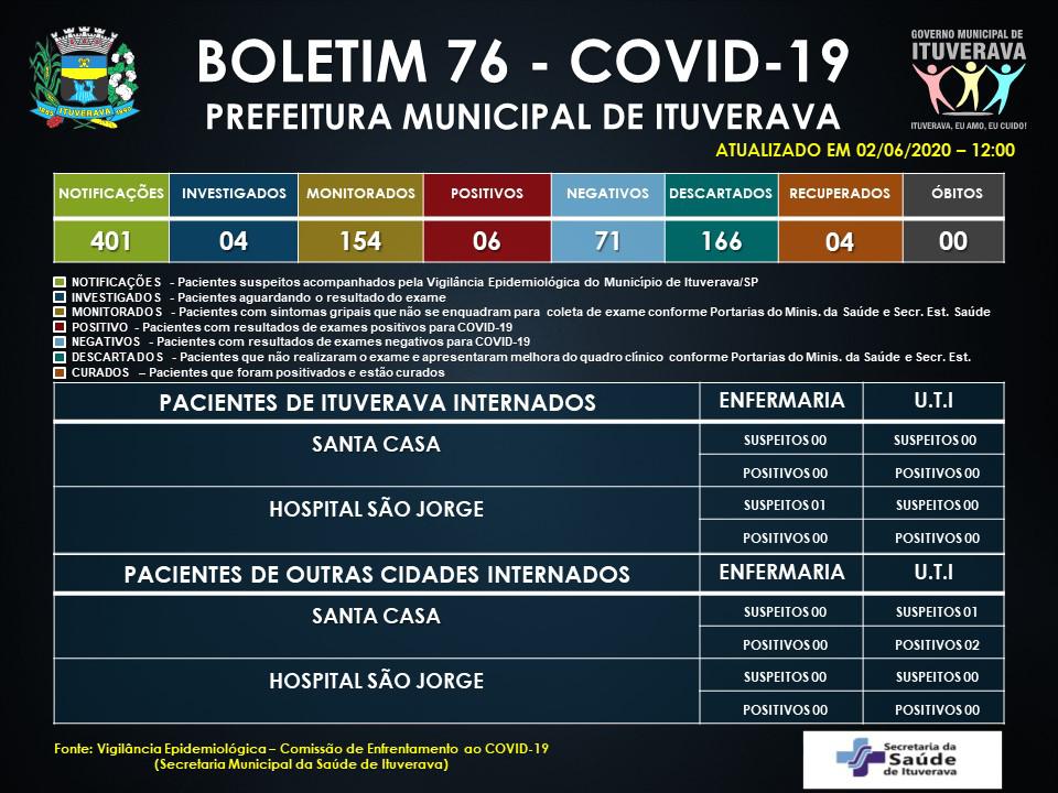 02/06/20 O Progresso de Ituverava Boletim COVID-19 Reforçamos o pedido para que todos se mantenham em suas casas e adotem todas as medidas de prevenção necessárias. Além disso, é obrigatório no município o uso de máscaras, para proteção de toda a população. Compartilhe isso: Compartilhar no WhatsApp(abre em nova janela) WhatsApp Compartilhar no Facebook(abre em nova janela) Facebook Compartilhar no X(abre em nova janela) 18+ Relacionado