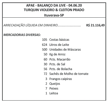 Claro que isso graças ao grande apoio de nossa sociedade ituveravense, de toda região e de diversas partes do Brasil e até de fora do país, que sem medir esforços e imbuídos com profundo sentimento de amor e generosidade contribuíram com doações de prendas, patrocínios, cestas de alimentos, caixas de leite, em dinheiro e de outros produtos e mercadorias, na realização da Live Solidária de grande sucesso em prol da APAE de Ituverava-SP, realizada dia 04 de junho de iniciativa de TURQUIN VIOLEIRO & CLEITON PRADO e duplas convidadas: LUIZ FERNANDO & RAMON, FERNANDO & THIAGO, JORGE & RICARDO, dos músicos NATAN-Violão / KINDIN-Baixo / MARCELINHO-Sanfona, dos técnicos MIKAEL e ALEX, do radialista e locutor PAULO ANTÔNIO RODRIGUES, funcionários, diretores e a todos que acreditam em nosso trabalho, portanto só nos resta expressarmos nossa eterna gratidão pelo grande volume e sucesso do evento, conforme demonstrativo abaixo.