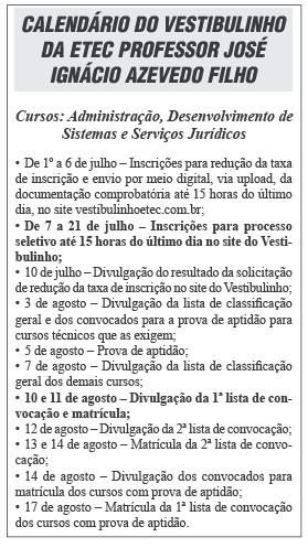 A Etec (Escola Técnica) Professor José Ignácio Azevedo Filho está com as inscrições abertas para o Vestibulinho do 2º semestre de 2020 e com muitas novidades. As inscrições do processo seletivo vão de sete de julho até as 15h de 21 de julho. Todo o processo será on-line e os interessados em ingressar no 2º semestre de 2020 devem fazer o cadastro no site do Vestibulinho (www. vestibulinhoetec.com.br).