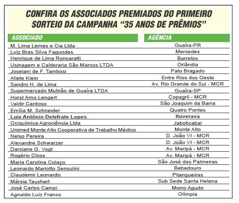 O Sicredi Aliança PR/SP realizou na manhã de quinta-feira (02) o primeiro sorteio da campanha “35 Anos de Prêmios” que ocorre em comemoração aos 35 anos da cooperativa. Na oportunidade, foram sorteadas 24 motos: 12 Honda CG e 12 Yamaha Factor.