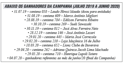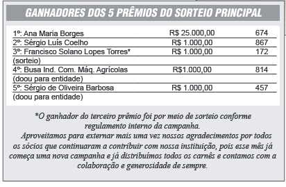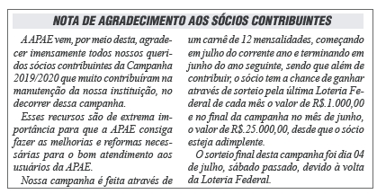 Em seguida, confira a nota de agradecimento enviada à redação pela diretoria da APAE e no quadro os ganhadores do sorteio principal e demais ganhadores do decorrer do ano da Promoção 2019/2020.
