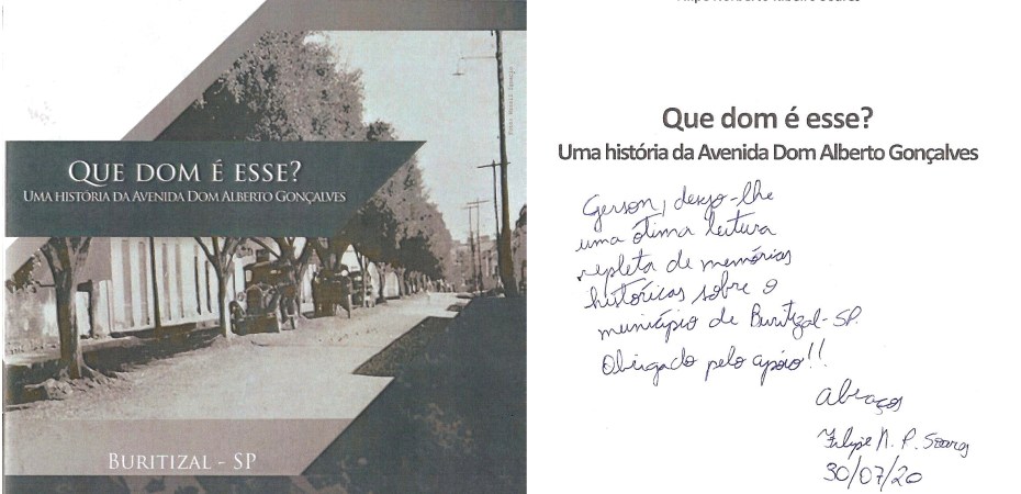 Hoje, recebemos em mãos um exemplar do livro “Que dom é esse? – Uma história da Avenida Dom Alberto Gonçalves”, de autoria de Filipe Norberto Ribeiro Soares, da cidade de Buritizal. Agradecemos pela lembrança, consideração e dedicatória. Desejamos sucesso e prosperidade ao Filipe.