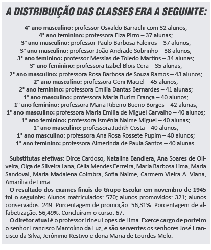 Já no ano de 1945: o município de Ituverava está servido por 17 escolas isoladas estaduais, sendo 13 rurais e 4 urbanas e por 6 escolas isoladas municipais (rurais). São as escolas isoladas estaduais: Escola mista da Fazenda Monte Alegre – professora Cecília Neaime; Escola mista da Fazenda Santana – professora Maria de Lourdes Pereira Campi; Escola mista da Fazenda Santa Izilda – professora Maria Auxiliadora Lelis; Escola mista da Fazenda Santa Leopoldina – professora Carmen Henrique de Miranda; Escola mista da Fazenda Altamira – professora Cremilda Teixeira; Escola masculina do Bairro Capivari – professor Geraldo Seixas Santos; 2° Escola mista do Bairro São Benedito – professora Rita Solange Barbosa; 1° Escola mista do Bairro São Benedito – professora Suzana da Silva Lana; 3° Escola mista do Bairro Capivari – Basílica Possa; 2° Escola urbana de Ituverava – professora Mercedes Naime Nasrala; Escola mista da Fazenda Santa Emília – professora Jovelina Lúcio Henrique; Escola urbana de Ituverava – professor Célio Caleiro Lima; 3° Escola mista urbana de Ituverava – professora Maria da Glória G. Andrade; 2° Escola mista do Bairro Capivari – professora Hercília Aparecida Neves; 1° Escola mista urbana de Ituverava – professora Geni Bittecourt; Escola mista da Fazenda da Mata – professora Olga da Silveira Lana. Total de alunos matriculados: masculinos – 389; femininos – 269. Alunos aprovados em 1945 – 374.