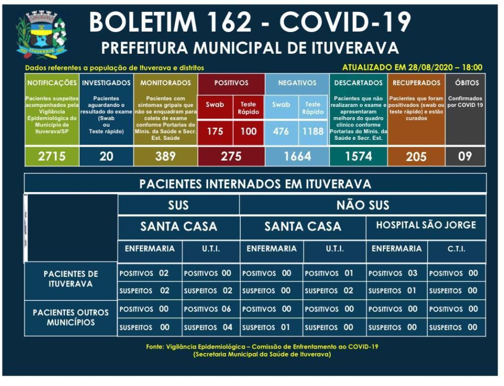 Ituverava registrou mais 10 casos confirmados de COVID-19. Um paciente está internado e os demais estão em isolamento domiciliar e sendo acompanhados pela Vigilância Epidemiológica.