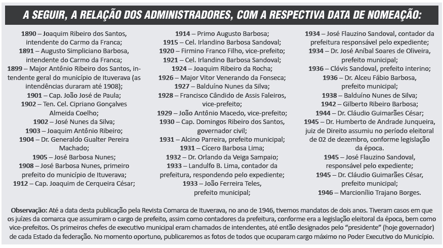 O poder municipal em Ituverava é exercido por um prefeito de livre escolha do senhor interventor federal. Mais abaixo damos, pela primeira vez, a lista completa de todas as pessoas que estiveram à frente da administração do município (publicado em 1946).