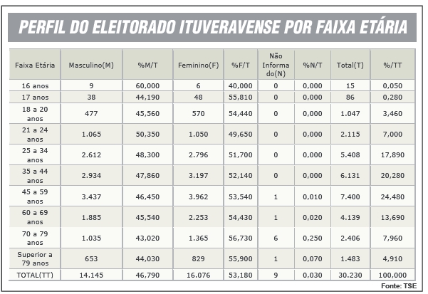 A maior parte do eleitorado ituveravense também está na faixa etária entre 45 e 59 anos de idade, ou seja, 7.400 eleitores o que representa 24.48% das pessoas que estão aptas a votar em 2020.