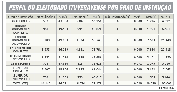 Conforme divulgou o Tribunal, portanto, Ituverava tem 30.230 eleitores. A maior parte dos votantes na cidade são mulheres, que representam 53,18% do eleitorado, enquanto que os homens somam 46,79% do total.