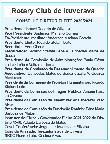 Tomou posse a nova Diretoria do Rotary Club de Ituverava, referente ao ano Rotário 2020/2021. O novo presidente é o empresário Ismael Roberto de Oliveira, que soma 28 anos de vida Rotária e a terceira vez assumindo a presidência do clube. Confira o quadro com o Conselho Diretor eleito.
