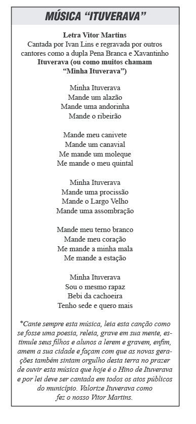 Entre as músicas de Vitor Martins está a conhecida por todos seus conterrâneos “Ituverava”, chamada por muitos como “Minha Ituverava”, embora não altere o seu o contexto ou que despertou a criatividade, lembrança e amor por sua terra, qual descrevemos para lembrar. Vitor ainda visita muito nossa cidade e não perde o seu hobby de caminhar pelos lados mais naturais da cidade, ainda que cada vez mais difícil de se encontrar, acreditamos ser onde ele se sinta mais ituveravense.