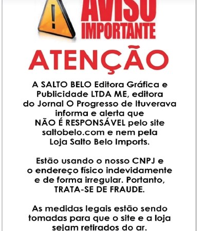 A Direção da Salto Belo Editora e Gráfica/Jornal O Progresso solicita a quem tiver acesso tanto ao Facebook como à página do Jornal, que copie o anúncio e encaminhe ou mesmo fotografe o alerta nesta página em seus grupos de redes sociais de amigos e familiares, a fim de alertar pessoas de outras cidades para que não caiam em possíveis golpes.