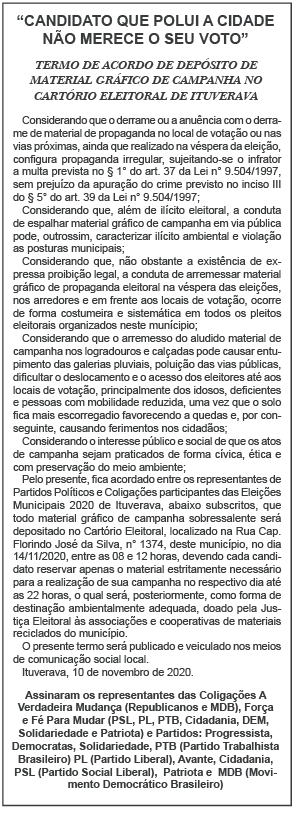 No Termo de Acordo foi convencionado (leia na íntegra no quadro abaixo), entre os partidos e coligações participantes do pleito eleitoral que todo material gráfico de campanha seria depositado no Cartório Eleitoral, no dia 14 de novembro de 2020, entre as 08 e 12 horas.