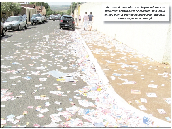 O município de Ituverava pode tornar-se exemplo para todo o Brasil e passar a adotar esta prática também para os próximos anos que tiveram eleições. Na terça-feira, dia 10 de novembro, os representantes de partidos e coligações da cidade, assinaram termo para evitar derrame de santinhos e outros tipos de materiais gráficos que sujam a cidade, poluem o meio ambiente e podem provocar até acidentes com pedestres.