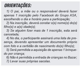 Veja no quadro as orientações para participar do 1° Bazar Solidário de brinquedos novos e usados do Grupo ASA.