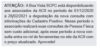 “Hoje a avaliação de crédito através da Boa Vista SCPC não se remete apenas em estar com o nome limpo, as novas consultas permitem que a empresa conheça o histórico do cliente através das novas informações oferecidas por esses bancos de dados citados, desta forma potencializando as consultas ao SCPC. É importante destacar que a aprovação final do crédito é de responsabilidade da empresa que está concedendo o crédito, a consulta trará os dados para que a empresa avalie o cliente mais cada uma trabalha com o seu critério de aprovação”, ressalta o diretor.