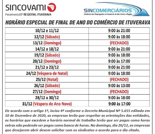Foi definido na última semana, entre o Sincovami (Sindicato do Comércio Varejista do Município de Ituverava) “Patronal” e o Sincomerciários (Sindicato dos Empregados no Comércio de Ituverava) o Horário Especial de Final de Ano do Comércio de Ituverava seguindo o decreto da prefeitura municipal 5.655 de 10 de dezembro, publicado de forma oficial no Jornal O Progresso.