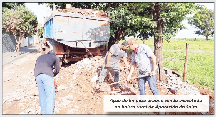 Na última semana, foi realizada uma limpeza urbana no distrito de Aparecida do Salto. A limpeza foi feita através de parcerias com empresários, que disponibilizaram veículos, máquinas e ferramentas para a ação.