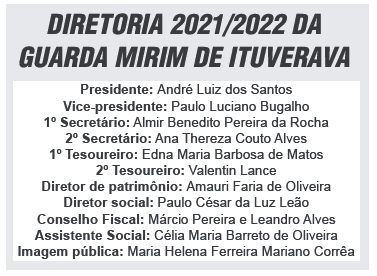 Veja o quadro com a Diretoria eleita para a gestão 2021/2022 da Guarda Mirim de Ituverava. O presidente do Rotary de Ituverava é Ismael Roberto de Oliveira, da Casa da Amizade Therezinha Inada de Oliveira e o governador do distrito 4540, Adauto Barbosa de Matos.