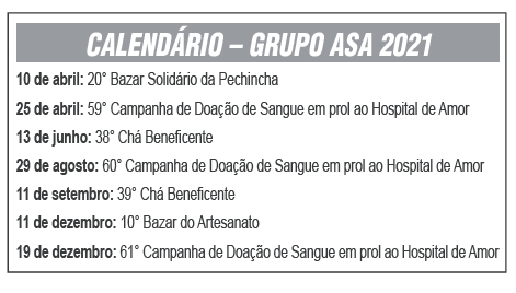 O Grupo ASA (Amizade, Solidariedade e Amor de Ituverava) divulgou na última semana seu calendário de eventos para o ano de 2021.