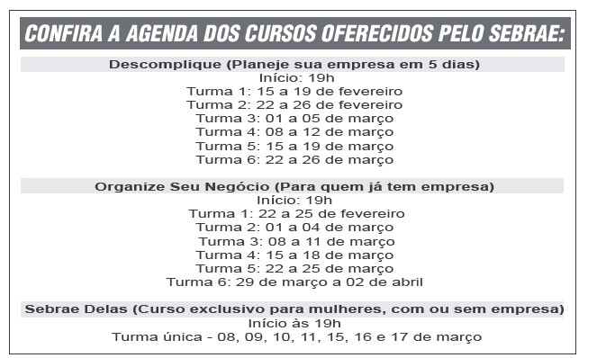 Além disso, haverá um curso focado no empreendedorismo feminino, com participação exclusiva para mulheres. Os cursos fazem parte do programa Empreenda Rápido e as inscrições são gratuitas. Serão abertas 13 turmas, que serão divididas de acordo com o perfil do inscrito: pessoa física ou pessoa jurídica.