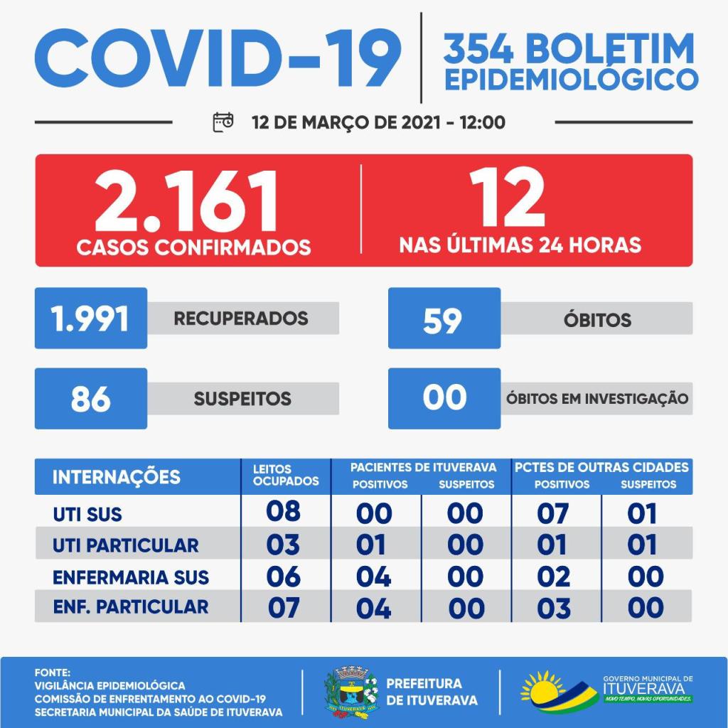 Ituverava registrou mais 12 confirmados de COVID-19. Nesse momento, para proteção de toda a população ituveravense, é fundamental que todos se mantenham em suas casas e adotem todas as medidas de prevenção necessárias, como evitar aglomerações, fazer o distanciamento social e o uso de máscaras, que é obrigatório no município.
