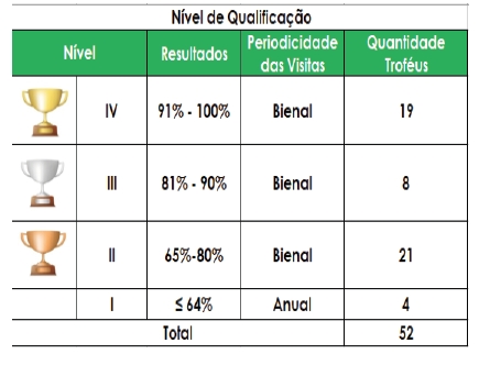 Para esta avaliação, foram utilizados requisitos baseados em normas técnicas conforme o tipo de serviço, onde o foco está na segurança do paciente, nas instalações e na qualidade, além da gestão do negócio e da responsabilidade socioambiental. As visitas foram executadas pela equipe técnica da Unimed, utilizando roteiros específicos de acordo com o serviço prestado, sendo que cada item avaliado foi computado como: CONFORME 100%, CONFORME PARCIALMENTE 50% e NÃO CONFORME 0%. A nota final foi calculada em percentual tendo como base o total de itens em que o prestador foi avaliado. A periodicidade das visitas foi definida através da pontuação obtida, distribuindo-se da seguinte forma: