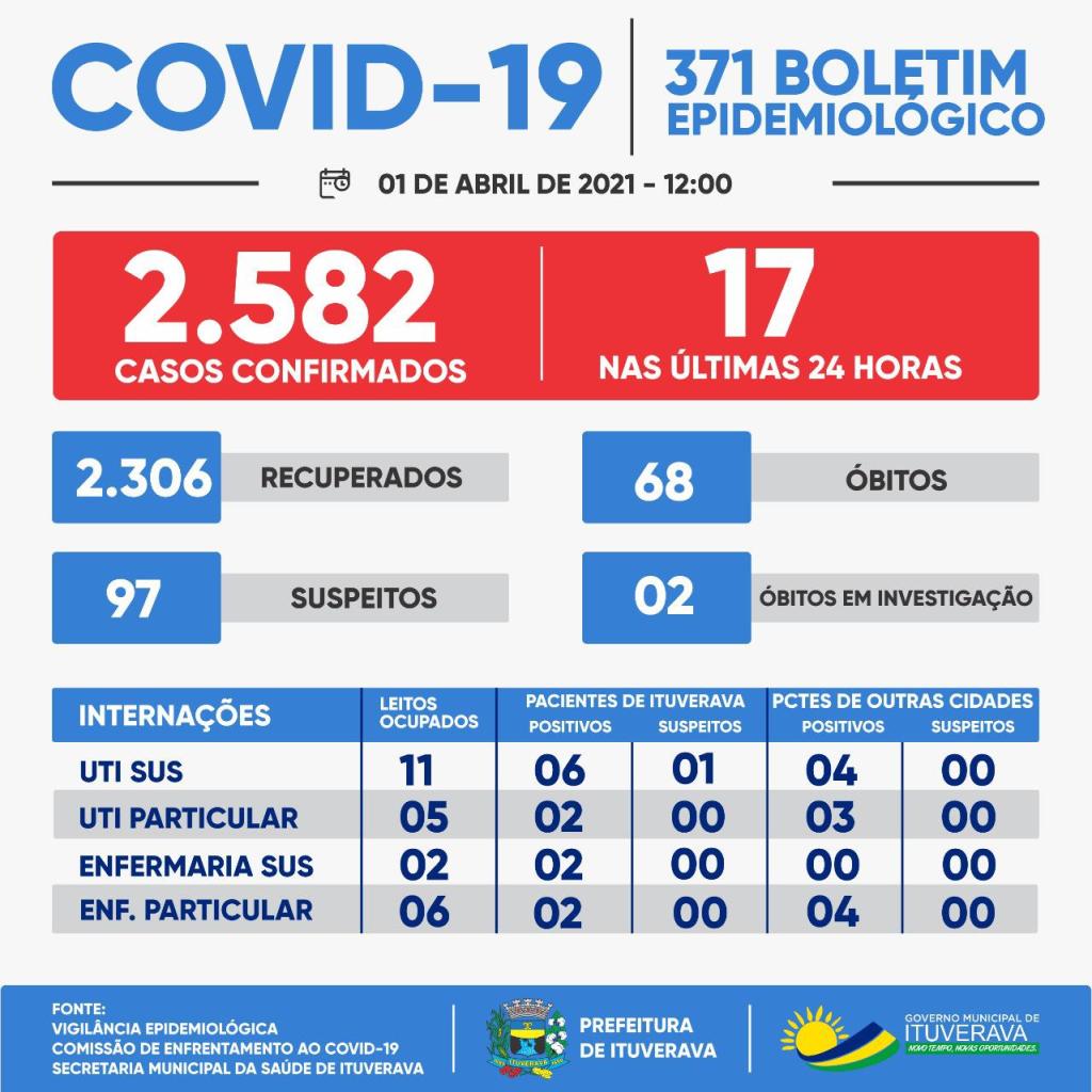 Ituverava registrou mais dois óbitos confirmados por COVID-19. Nossa solidariedade aos familiares e amigos das vítimas. Ademais, outros 17 casos da doença foram confirmados. Nesse momento, para proteção de toda a população ituveravense, é fundamental que todos se mantenham em suas casas e adotem todas as medidas de prevenção necessárias, como evitar aglomerações, fazer o distanciamento social e o uso de máscaras, que é obrigatório no município.