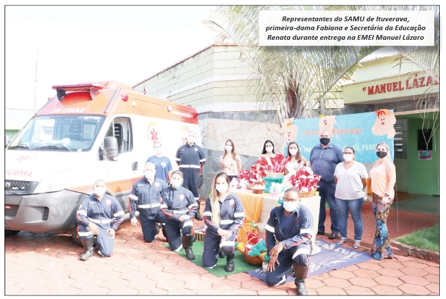 Na terça-feira, dia 30, foi realizada a doação de 120 ovos para as crianças matriculadas na EMEI Manuel Lázaro Pereira. Na ocasião, além da equipe SAMU, estiveram presentes a primeira-dama e secretária do Bem Estar e Integração Social, Fabiana Lima Araújo; a secretária da Saúde, Raquel Rezende; a secretária da Educação, Renata Sandoval; e outros membros das equipes. Além disso, os outros 80 ovos de páscoa que foram produzidos pelo “SAMU Solidário” estão sendo entregues para outras crianças de Ituverava e dos distritos.