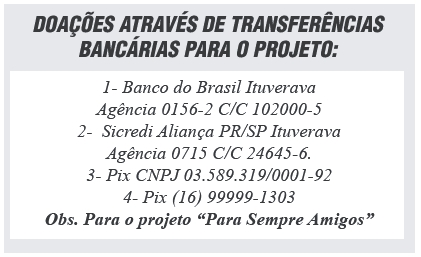 Em uma das ações para angariar fundos para o projeto, será realizada no dia 30 de abril uma Live solidária em prol do projeto “Para Sempre Amigos”. As doações deverão ser, inicialmente, em dinheiro por transferência ou QRCode que estará disponibilizado na tela durante a transmissão do evento.