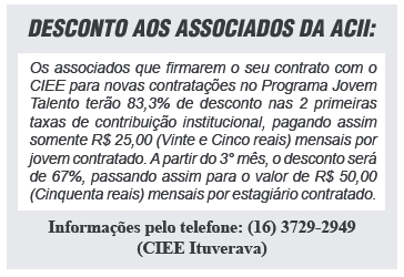 Além disso, sua organização disponibilizará um serviço de qualidade, realizado por uma entidade que está no mercado há mais de 57 anos e que tem expertise em Programas de Estágios e Aprendizagem. Com a parceria entre ACII e o CIEE, as entidades visam impulsionar a Economia de Ituverava no atual momento que os efeitos da pandemia afetam fortemente a Saúde e Economia.