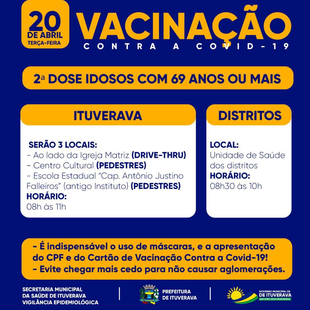 19/04/21 O Progresso de Ituverava Vacinação contra a COVID-19 segue em Ituverava Amanhã, dia 20 de abril, também será aplicada a segunda dose da vacina para os idosos com 69 anos que foram vacinados com Coronavac/Butantan. Confira as informações e compartilhe! Compartilhe isso: Compartilhar no WhatsApp(abre em nova janela) WhatsApp Compartilhar no Facebook(abre em nova janela) Facebook Compartilhar no X(abre em nova janela) 18+ Relacionado