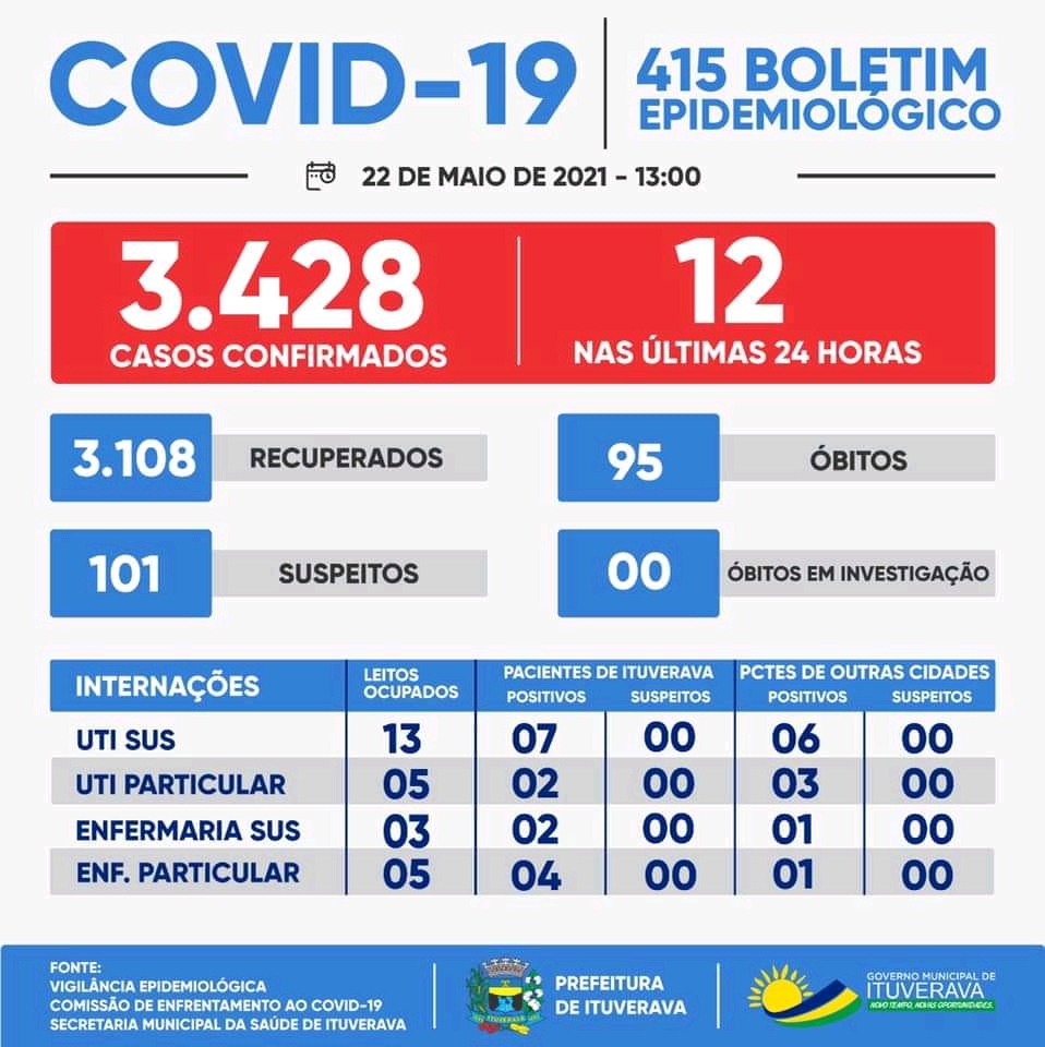 Ituverava registrou mais 12 casos confirmados de COVID-19. Nesse momento, para proteção de toda a população ituveravense, é fundamental que todos se mantenham em suas casas e adotem todas as medidas de prevenção necessárias, como evitar aglomerações, fazer o distanciamento social e o uso de máscaras, que é obrigatório no município.