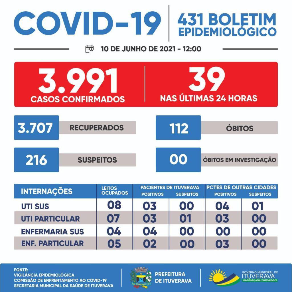 Ituverava registrou mais 39 casos confirmados de COVID-19. Nesse momento, para proteção de toda a população ituveravense, é fundamental que todos se mantenham em suas casas e adotem todas as medidas de prevenção necessárias, como evitar aglomerações, fazer o distanciamento social e o uso de máscaras, que é obrigatório no município.
